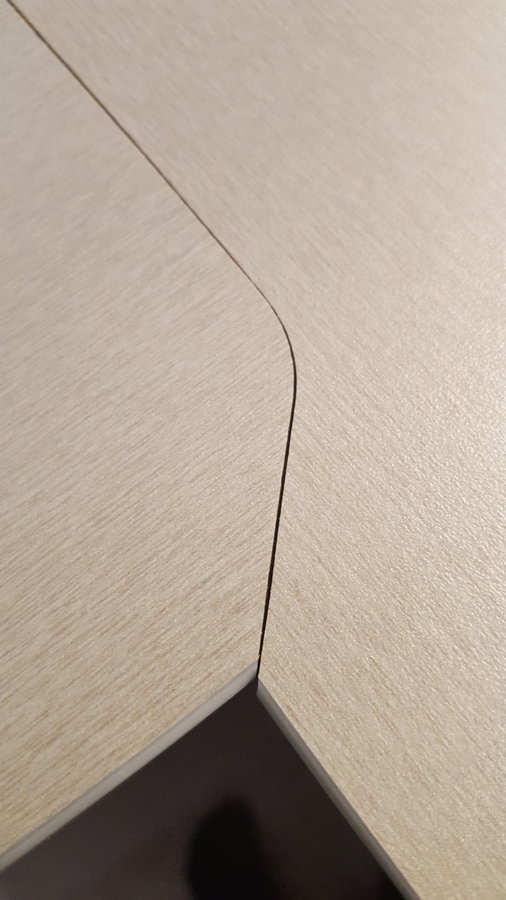 Soweit ist die schablone ok jedoch ergibt sich vorne an der arbeitsplatte in der rundung wo das kurze stück gehrung gefräst wird eine ungenauigkeit von etwa 1mm so das man an dieser stelle in der senkrechten einen kleiner versatz entsteht.